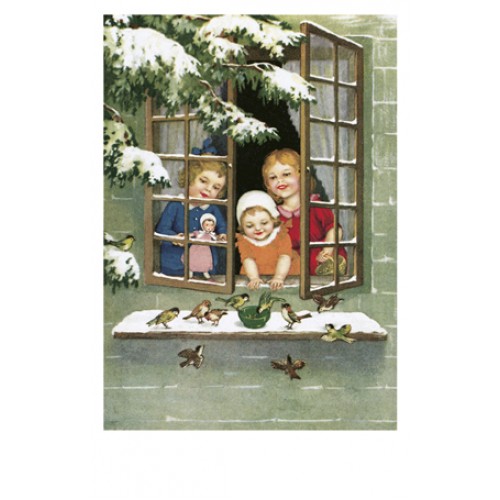 Trois enfants à la fenêtre nourrissant les oiseaux.